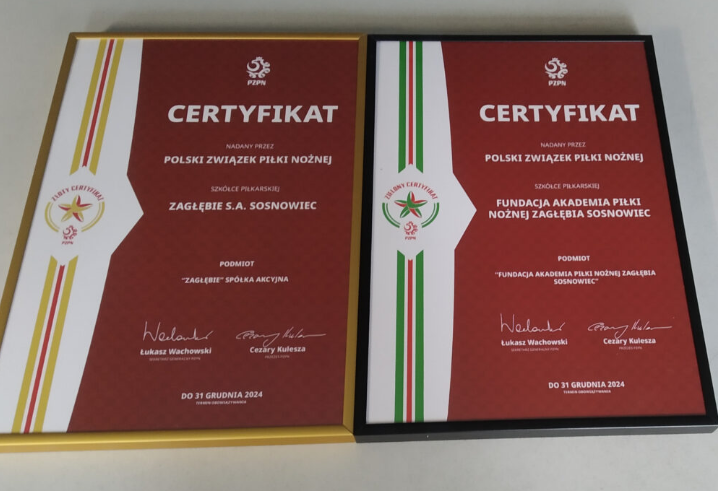 W trakcie spotkania prezesa Śląskiego Związku Piłki Nożnej Henryka Kuli z przedstawicielami Podokręgu Sosnowiec, Arkadiusz Aleksander, prezes Zagłębia w towarzystwie Adriana Barańskiego, prezesa Fundacji Akademia Piłki Nożnej Zagłębia Sosnowiec odebrali Złoty i Zielony Certyfikat nadany przez PZPN.