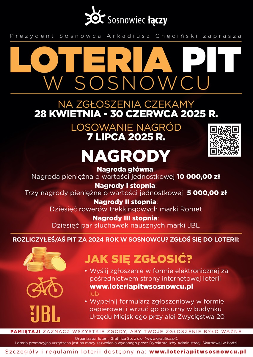 Ważne, aby przedmiotem zgłoszenia był PIT za 2024 rok złożony w sosnowieckim urzędzie skarbowym wraz ze wskazanym Sosnowcem jako miejscem zamieszkania w zeznaniu podatkowym. Losowanie laureatów odbyło się 7 lipca.