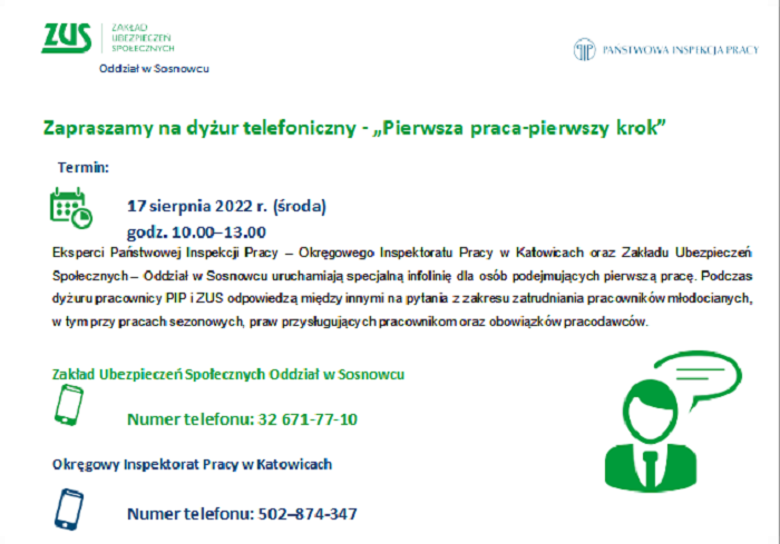 Już w środę 17 sierpnia sosnowiecki ZUS wraz z Okręgową Inspekcją Pracy uruchamia specjalną infolinię dla osób podejmujących pierwszą pracę.