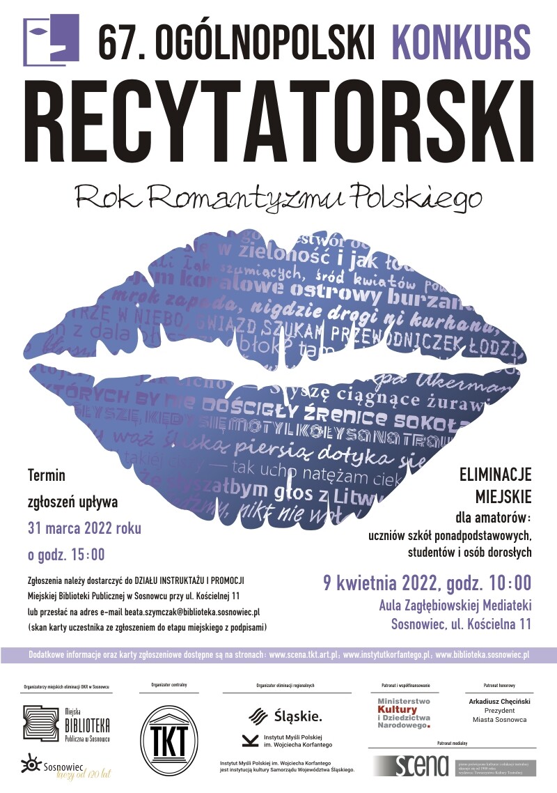 Miejska Biblioteka Publiczna im. Gustawa Daniłowskiego w Sosnowcu informuje, że Instytut Myśli Polskiej im. Wojciecha Korfantego w Katowicach, wzorem lat ubiegłych, ogłosił 67. edycję Ogólnopolskiego Konkursu Recytatorskiego dla amatorów: uczniów szkół ponadpodstawowych, studentów oraz osób dorosłych. Konkurs organizowany jest przez Towarzystwo Kultury Teatralnej w Warszawie, pod patronatem i przy finansowym wsparciu Ministerstwa Kultury i Dziedzictwa Narodowego oraz pod patronatem honorowym Prezydenta Miasta Sosnowca – Arkadiusza Chęcińskiego.
