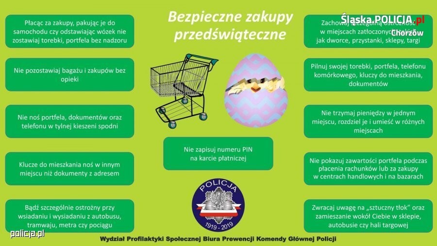 Podczas Świąt Wielkanocnych nad bezpieczeństwem czuwać będzie zwiększona liczba policjantów. Jeżeli cokolwiek wyda się nam niepokojące, zarówno kiedy poczujemy się zagrożeni, jak i w razie stwierdzenia kradzieży, nie wahajmy się zwrócić o pomoc. Takie przypadki należy zgłaszać znajdującym się w pobliżu policjantom lub dzwoniąc pod numer 112 lub 997.