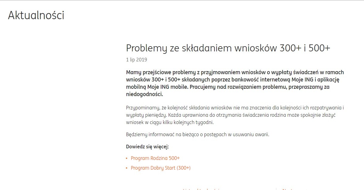 - Mamy przejściowe problemy z przyjmowaniem wniosków o wypłaty świadczeń w ramach wniosków 300+ i 500+ składanych poprzez bankowość internetową Moje ING i aplikację mobilną Moje ING mobile. Pracujemy nad rozwiązaniem problemu, przepraszamy za niedogodności. Przypominamy, że kolejność składania wniosków nie ma znaczenia dla kolejności ich rozpatrywania i wypłaty pieniędzy. Każda uprawniona do otrzymania świadczenia rodzina może spokojnie złożyć wniosek w ciągu kilku kolejnych tygodni. Będziemy informować na bieżąco o postępach w usuwaniu awarii – czytamy na stronie banku.