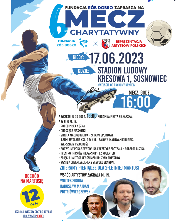 Reprezentacja Artystów Polskich, na którą co roku z radością czekacie, już po raz 6! zmierzy się na murawie Stadionu Ludowego z Drużyną Fundacji Rób Dobro.