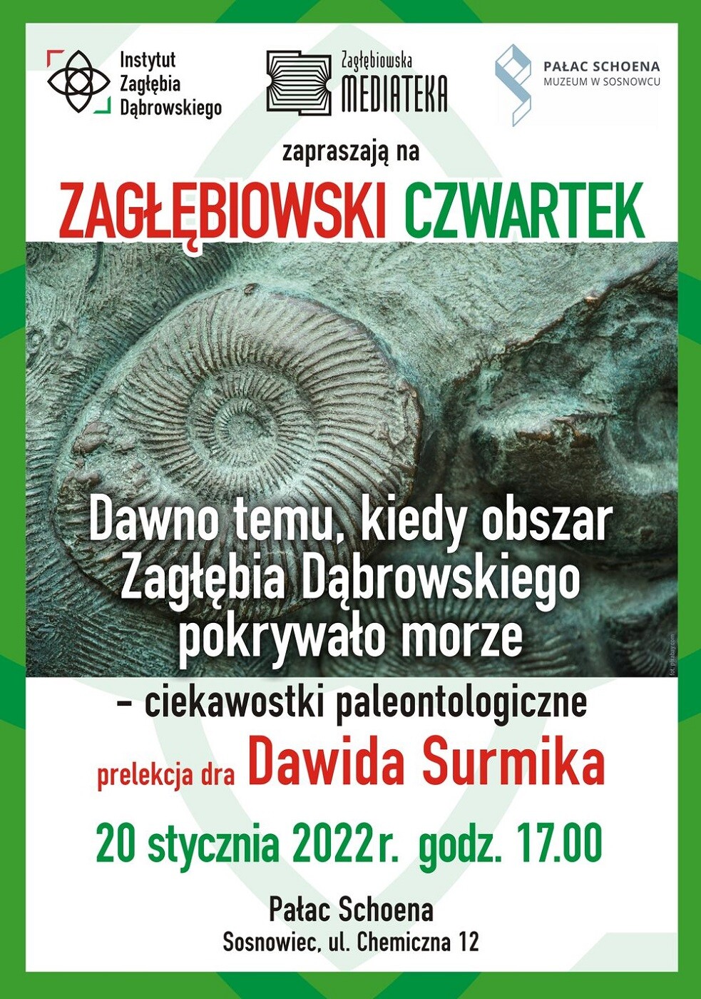 Spotkanie odbędzie się 20 stycznia 2022 o godz. 17.00. Naszym gościem będzie dr Dawid Surmik, adiunkt Instytutu Nauk o Ziemi Uniwersytetu Śląskiego, który wygłosi prelekcję zatytułowaną "Dawno temu, kiedy obszar Zagłębia Dąbrowskiego pokrywało morze – ciekawostki paleontologiczne". Wstęp wolny.