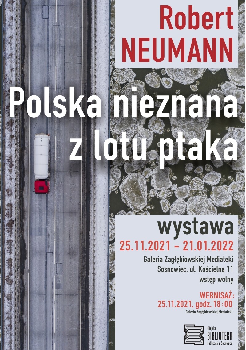 Miejska Biblioteka Publiczna w Sosnowcu serdecznie zaprasza na wystawę fotograficzną Roberta Neumanna „Polska nieznana z lotu ptaka”, która będzie udostępniana w Galerii Zagłębiowskiej Mediateki przy ul. Kościelnej 11 od 25 listopada 2021 do 21 stycznia 2022. Wernisaż wystawy odbędzie się w czwartek 25 listopada 2021 o godz. 18.00. Wstęp wolny.