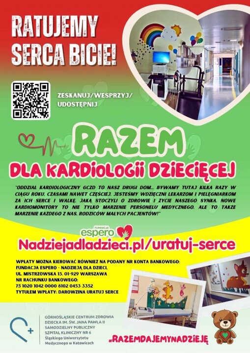 Górnośląskie Centrum Zdrowia Dziecka im.Św. Jana Pawła II w Katowicach i Fundacja Espero rozpoczęły akcję zbierania funduszy na kardiomonitory dla Oddziału Kardiologii Dziecięcej Górnośląskiego Centrum Zdrowia Dziecka.