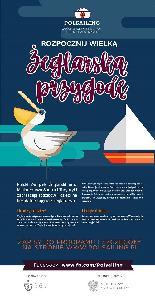 Już istnieje możliwość zarejestrowania się do programu PolSailing, na podstawie którego uczestnik będzie mógł skorzystać z 15 godzin bezpłatnej edukacji żeglarskiej na łódce klasy Optimist (7-10 lat). Uczestnicy zapoznają się z zasadami bezpieczeństwa nad wodą, nauczą się podstaw żeglowania, otrzymają materiały szkoleniowe – podręczniki „ABC Optimista" karty umiejętności, a na koniec certyfikat „Zdolnego Żeglarza”, jako motywacja do dalszego rozwoju.