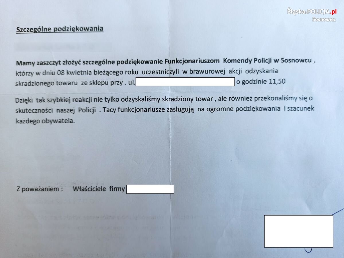 Do zdarzenia doszło w kwietniu 2022 roku w jednym ze sklepów w dzielnicy Klimontów. Sprawca włożył towary do sklepowego koszyka, po czym wybiegł z nimi ze sklepu. Wezwani na miejsce policjanci z Komisariatu Policji III szybko wytropili i zatrzymali złodzieja. Odebrane mu towary wróciły na sklepowe półki, a podejrzany usłyszał zarzut kradzieży. Pokrzywdzony postanowił przesłać na ręce Komendanta Miejskiego Policji w Sosnowcu swoje podziękowania za ich skuteczne działanie: