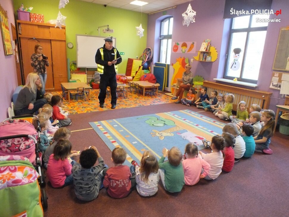 Sosnowieccy policjanci z wydziału ruchu drogowego odwiedzili maluchy z Niepublicznego Przedszkola „Elfik” w Sosnowcu przy ul. Stalowej.