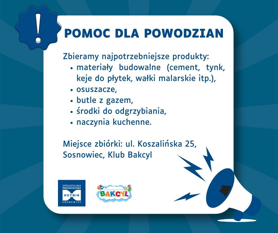 Spółdzielnia Mieszkaniowa “Hutnik” angażuje się także w inne działania na rzecz lokalnej społeczności. W odpowiedzi na niedawne wydarzenia związane z powodziami w naszym kraju zorganizowana została zbiórka dla osób najbardziej poszkodowanych. Mieszkańcy wykazali się ogromną solidarnością i chętnie włączyli się w akcję i pomoc dla potrzebujących. Każdy, kto chciałby jeszcze wspomóc takie osoby, może przynieść aktualnie najpotrzebniejsze rzeczy, takie jak: materiały budowlane (cement, tynk, keje do płytek, wałki malarskie itp.), osuszacze, butle z gazem, środki do odgrzybiania, naczynia kuchenne do Klubu Bakcyl, przy ul. Koszalińskiej 23.