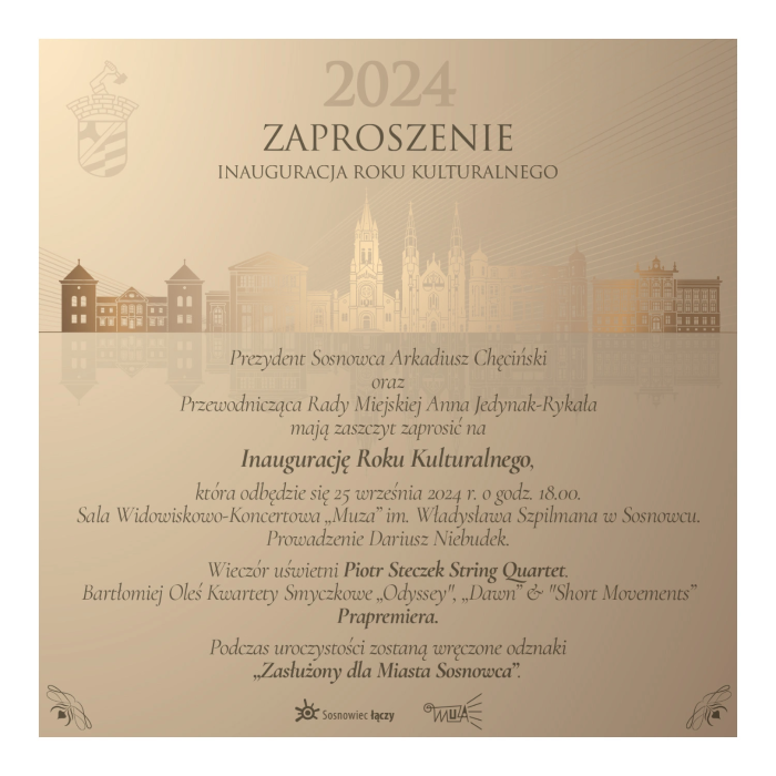 W imieniu władz miasta serdecznie zapraszamy na Inaugurację Roku Kulturalnego, która odbędzie się 25 września o godz. 18.00 w Sali Widowiskowo-Koncertowa Muza im. Władysława Szpilmana.