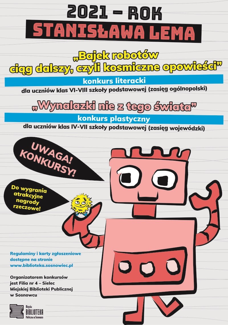 Miejska Biblioteka Publiczna w Sosnowcu, Filia nr 4 – Sielec, serdecznie zaprasza uczniów szkół podstawowych do udziału w konkursach literackim i plastycznym, inspirowanych twórczością Stanisława Lema. Szczegółowe regulaminy i karty zgłoszeniowe OBU konkursów znajdują się poniżej.