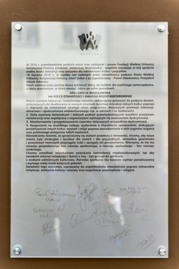 Wyrazili w niej sprzeciw wobec braku tolerancji i szacunku dla odmienności kultur i poglądów. 12 czerwca prezydenci Gdańska i Wrocławia, w obecności Arkadiusza Chęcińskiego i innych samorządowców, odsłonili tablicę z treścią tej deklaracji – w hołdzie dla jednego z jej sygnatariuszy, tragicznie zmarłego w styczniu br. prezydenta Pawła Adamowicza.