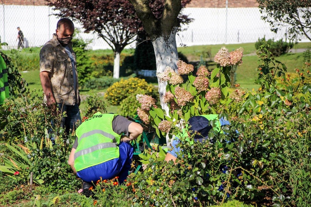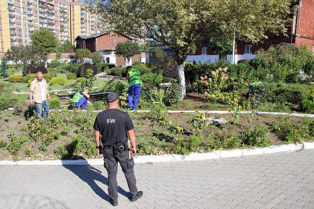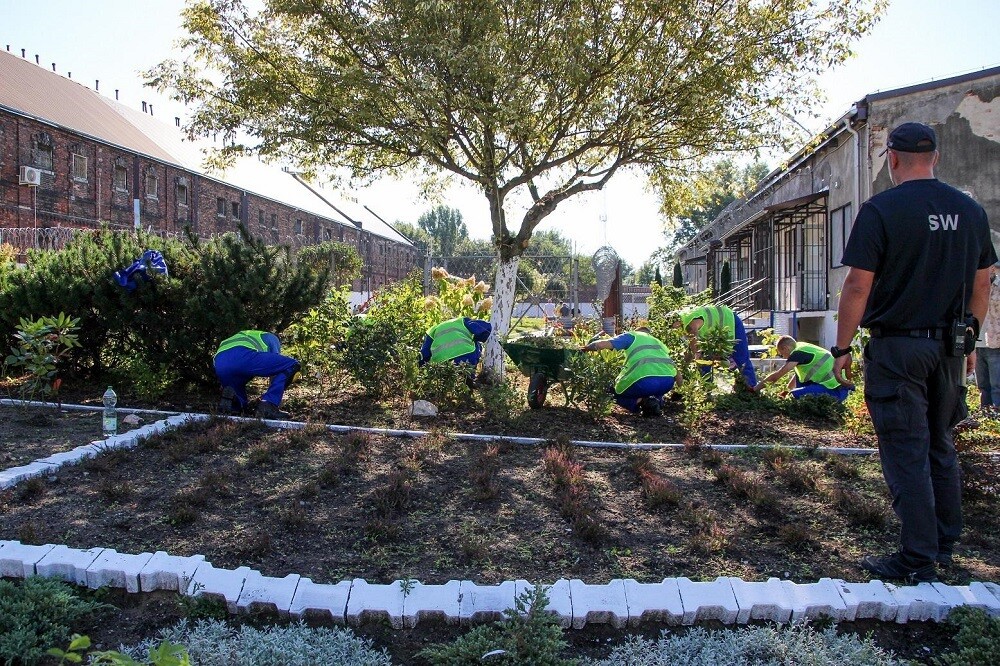 W ramach zajęć praktycznych w trakcie kursu osadzeni wykonują prace związane z rewitalizacją ogrodu na terenie sosnowieckiego aresztu.