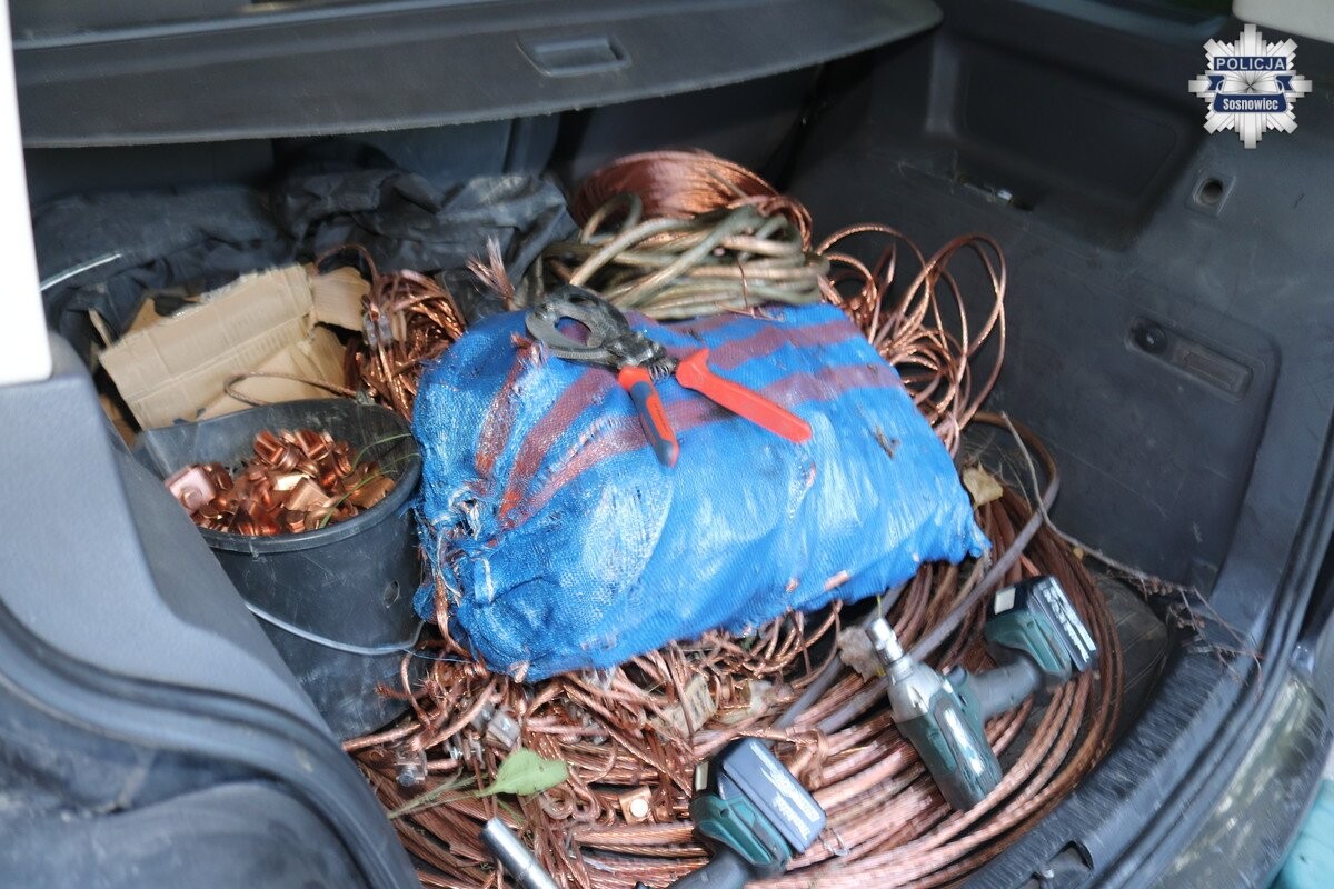 Kilka godzin po zgłoszeniach policjanci z Wydziału Kryminalnego Komendy Miejskiej Policji w Sosnowcu, patrolując ulicę Andersa, zwrócili uwagę na samochód marki Volkswagen, którego kierowca na widok radiowozu zachowywał się nerwowo. Mężczyzna przepakowywał z bagażnika różne przedmioty do drugiego auta – marki Audi. Okazało się, że był to 37-letni mieszkaniec Sosnowca. W samochodzie funkcjonariusze znaleźli miedziane liny trakcyjne oraz różnego rodzaju elektronarzędzia.