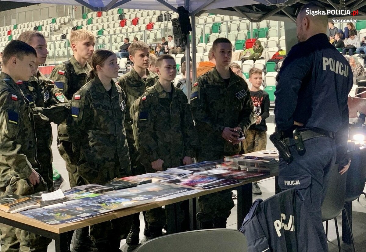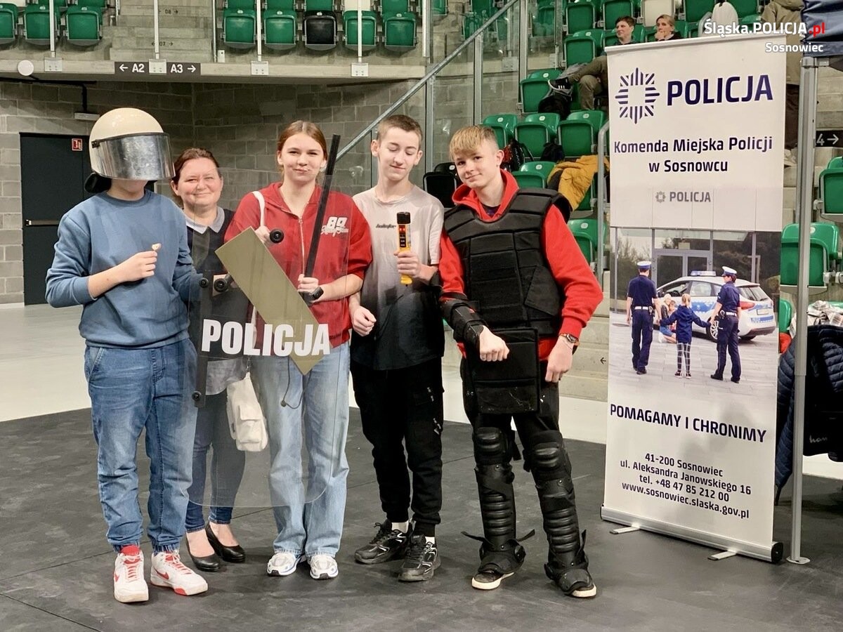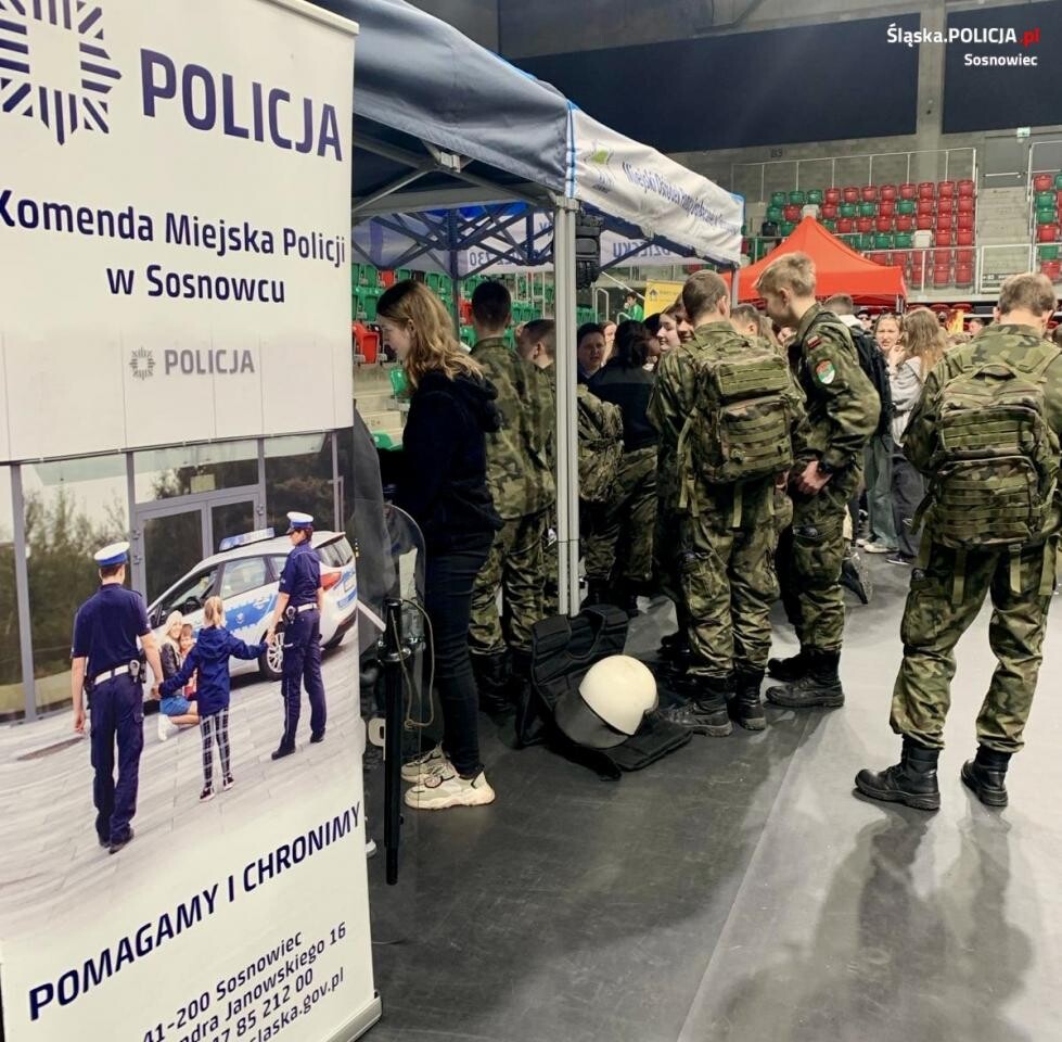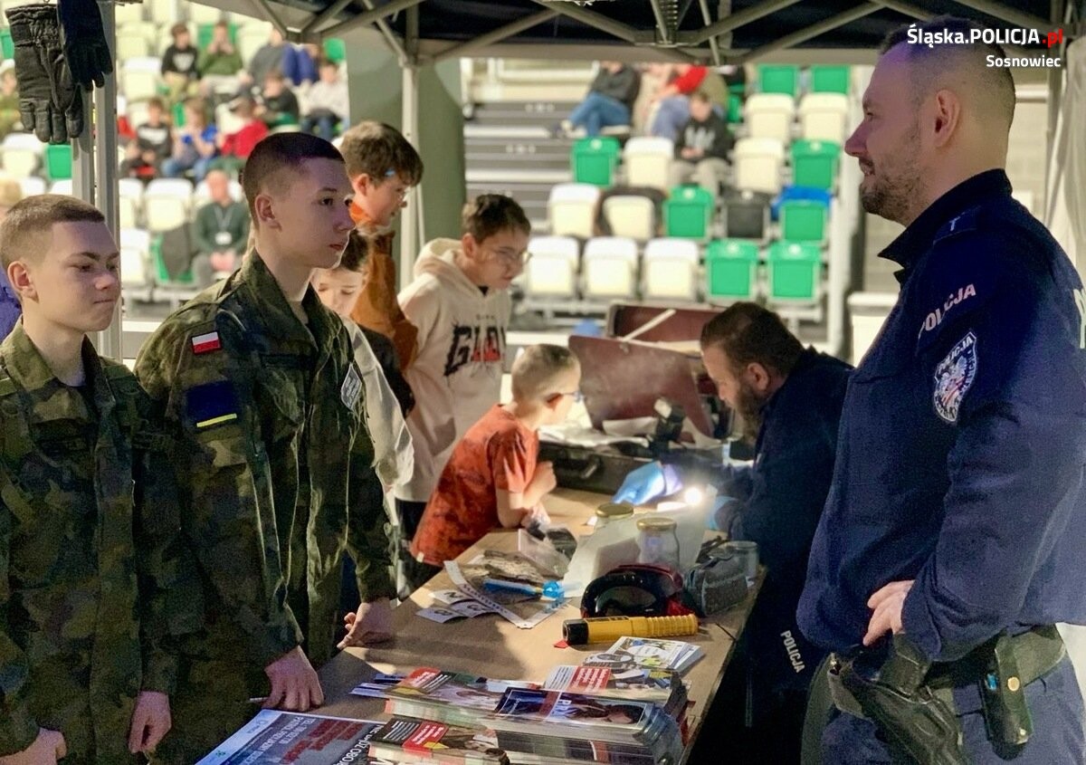 Na arenie uczniowie mieli okazję porozmawiać z sosnowieckimi policjantami, którzy przygotowali dla nich stoisko profilaktyczne. Młodzież mogła zobaczyć sprzęt, z którego na co dzień korzystamy oraz dowiedzieć się, jak wygląda służba technika kryminalistyki. Mundurowi zachęcali uczniów do wstąpienia w nasze szeregi. Opowiedzieli zainteresowanym osobom, jakie wymagania musi spełniać kandydat do służby w Policji, a także, jak wygląda rekrutacja i służba w poszczególnych pionach sosnowieckiej komendy. Młodzież mogła również obejrzeć z bliska radiowozy oraz motocykle służbowe.