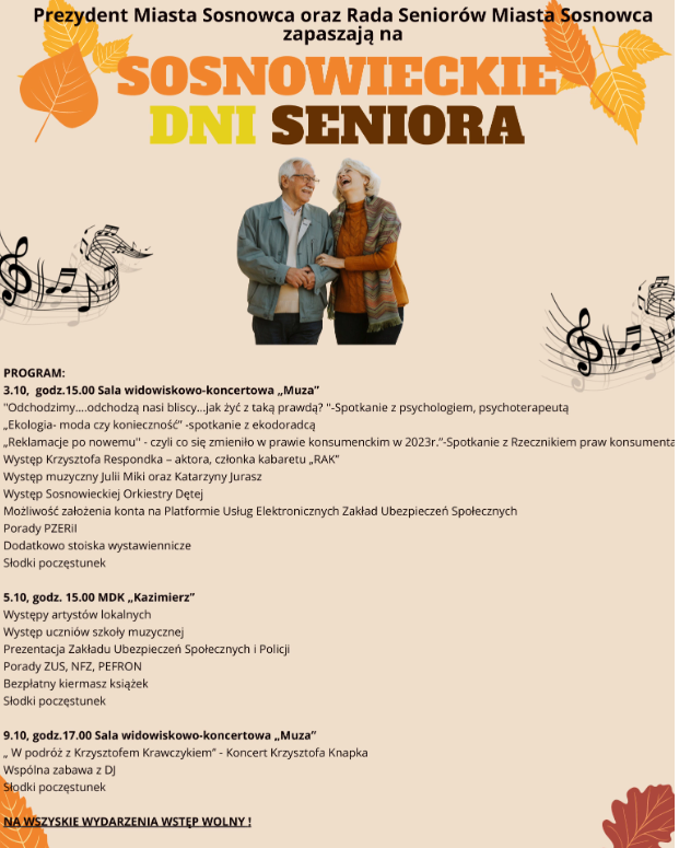 Urząd Miasta Sosnowiec zaprasza na Sosnowieckie Dni Seniora. Wstęp na wszystkie wydarzenia jest bezpłatny.