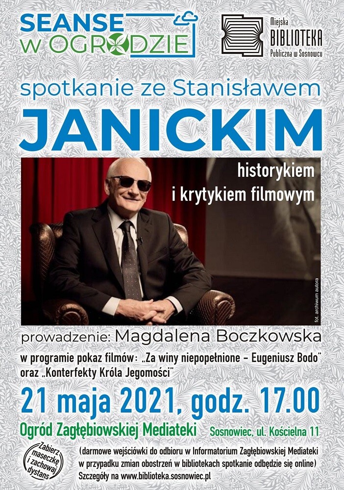 Zagłębiowska Mediateka serdecznie zaprasza w piątek 21 maja 2021 o godz. 17.00 na spotkanie z legendą telewizji, prowadzącym kultowy już program „W starym kinie”, Stanisławem Janickim. Rozmowę poprowadzi Magdalena Boczkowska, a dodatkową atrakcją będzie prezentacja dwóch filmów: „Za winy niepopełnione – Eugeniusz Bodo” (1997) oraz „Konterfekty Króla Jegomości” (1983). Spotkanie zainauguruje nowy projekt Zagłębiowskiej Mediateki, czyli Seanse w Ogrodzie – cykliczne filmowe spotkania w plenerze, zaplanowane na cały sezon wiosenno-letni 2021 (szczegóły programu już wkrótce!).
