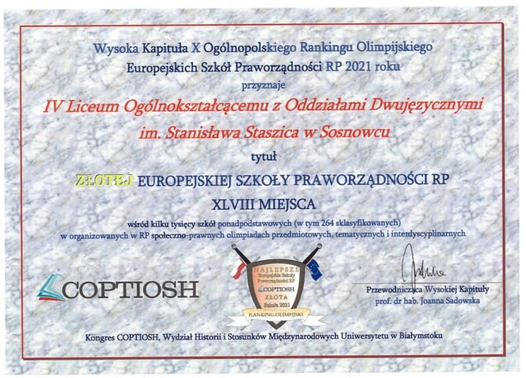 Wysoka Kapituła X Ogólnopolskiego Rankingu Olimpijskiego Europejskich Szkół Praworządności przyznała IV Liceum Ogólnokształcącemu z Oddziałami Dwujęzycznymi im.St.Staszica w Sosnowcu tytuł Złotej Europejskiej Szkoły Praworządności.Staszic znalazł się na zaszczytnym 48 miejscu wśród kilku tysięcy szkół ponadpodstawowych.