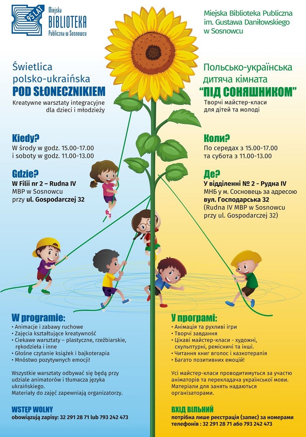 Filia nr 2 – Rudna IV Miejskiej Biblioteki Publicznej w Sosnowcu (ul. Gospodarcza 32) serdecznie zaprasza na kreatywne warsztaty integracyjne dla dzieci i młodzieży w świetlicy polsko-ukraińskiej „Pod Słonecznikiem”. Kiedy? W środy w godz. 15.00-17.00 i soboty w godz. 11.00 – 13.00.