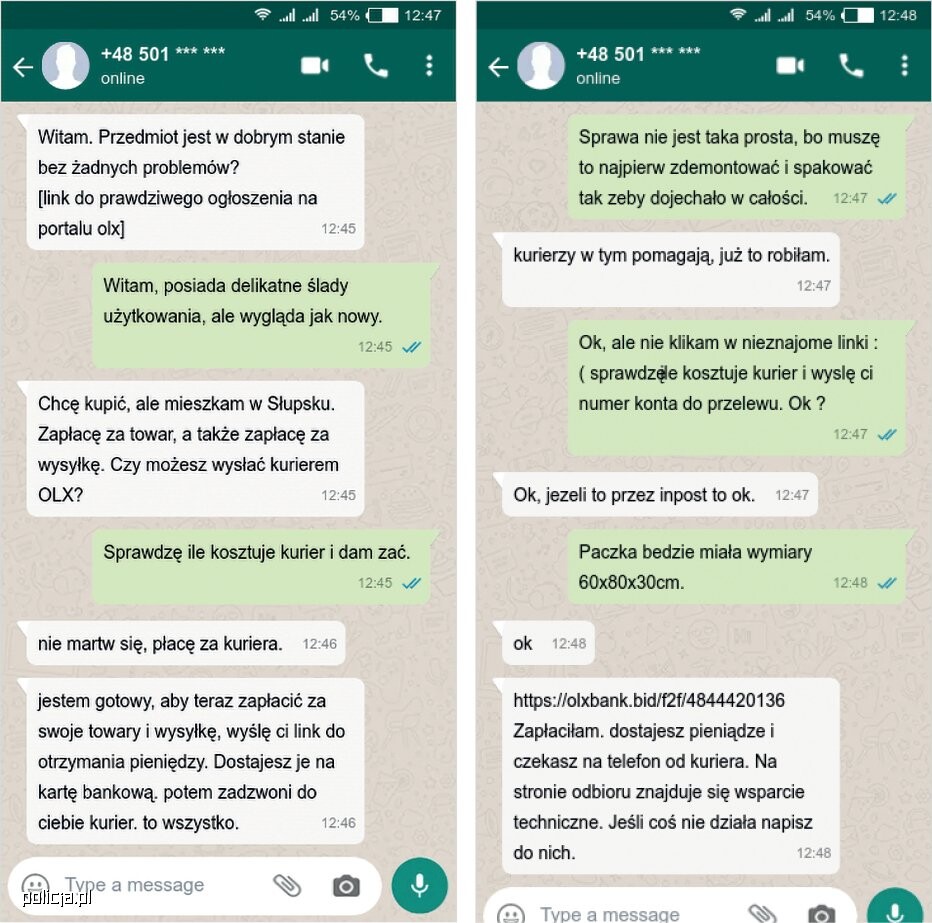 - Przestępcy kontaktują się w sprawie zakupu przedmiotów wystawionych na sprzedaż, wykorzystując komunikator WhatsApp.