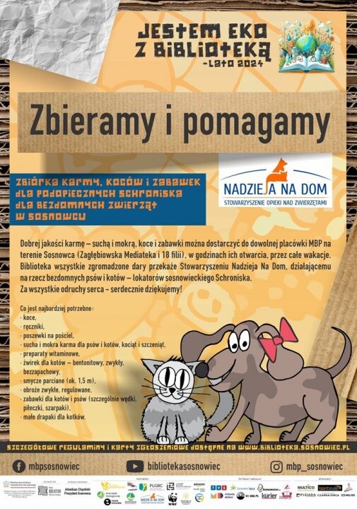 Miejska Biblioteka Publiczna w Sosnowcu – organizator akcji „Jestem EKO z BIBLIOTEKĄ – lato 2024” – gorąco zachęca do wsparcia zbiórki charytatywnej na rzecz podopiecznych Schroniska dla Bezdomnych Zwierząt w Sosnowcu.