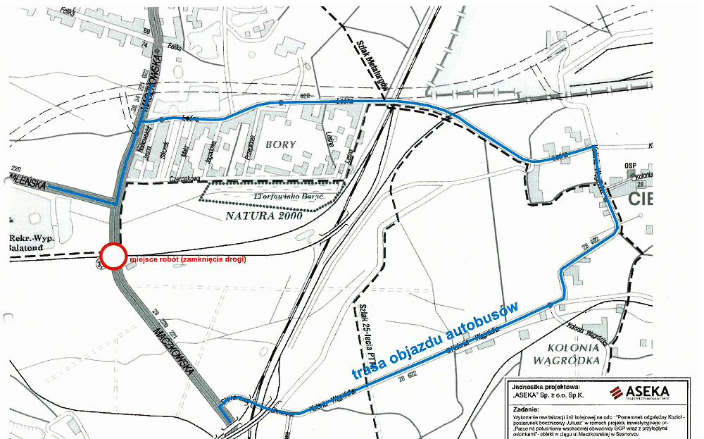 Objazd poprowadzony zostanie ulicami: Skwerowa, Kolonia Wągródka, Leśna. Objazd dotyczy także autobusów linii 220, 221, 622 oraz 835.