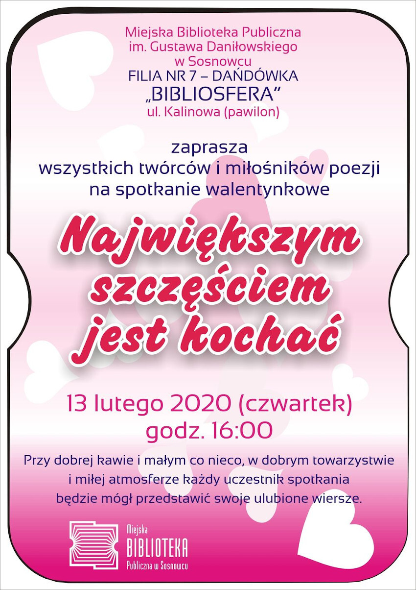 Filia nr 7 - BIBLIOSFERA Miejskiej Biblioteki Publicznej w Sosnowcu serdecznie zaprasza wszystkich twórców i miłośników poezji do udziału w walentynkowym spotkaniu "Największym szczęściem jest kochać", które odbędzie się w czwartek 13 lutego 2020 o godz. 16.00 w siedzibie biblioteki przy ul. Kalinowej (pawilon).