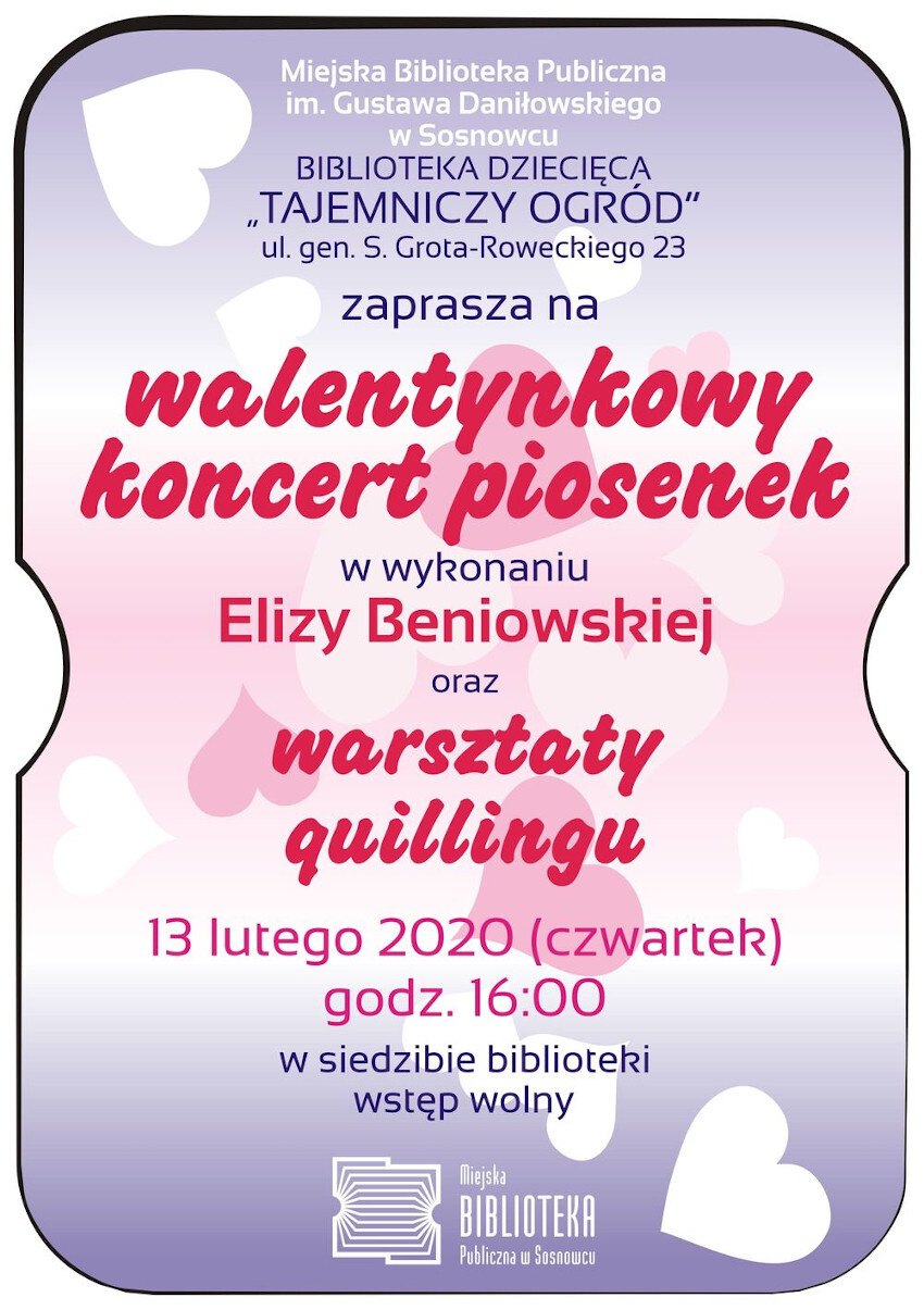 Biblioteka Dziecięca "Tajemniczy Ogród" serdecznie zaprasza w czwartek 13 lutego 2020 na walentynkowy koncert piosenek w wykonaniu Elizy Beniowskiej oraz warsztaty quillingu.