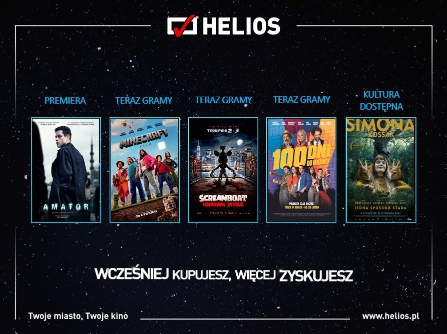 Nadchodzący tydzień przyniesie emocjonujące seanse w kinach Helios. Poza filmową nowością „Amator”, na ekranach zagoszczą wyjątkowe projekty specjalne oraz uwielbiane przez widzów stałe cykle. Ponadto 14 kwietnia w całej sieci zostanie wyświetlony pierwszy odcinek nowego sezonu serialu HBO Original „The Last of Us”.