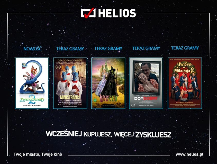 W repertuarze Heliosa znajdą się też najchętniej oglądane filmy ostatnich tygodni, takie jak szeroko komentowany „Dom dobry” w reżyserii Wojciecha Smarzowskiego. Obraz przedstawia toksyczny związek Gośki i Grześka, w którym dochodzi do coraz bardziej niebezpiecznych sytuacji, a przemoc staje się codziennością. . . W głównych rolach wystąpili Agata Turkot i Tomasz Schuchardt. Innym polskim tytułem w ofercie sieci będzie „Uwierz w Mikołaja 2”. Kontynuacja przeboju opowiada o różnorodnym przeżywaniu Świąt Bożego Narodzenia – tym razem Ania z Robertem biorą ślub, a Zosia zostaje pod opieką babci Sabinki. Seniorka niespodziewanie trafia do szpitala, a mała wyrusza na poszukiwania prawdziwego świętego Mikołaja, wierząc, że pomoże on babci. . .