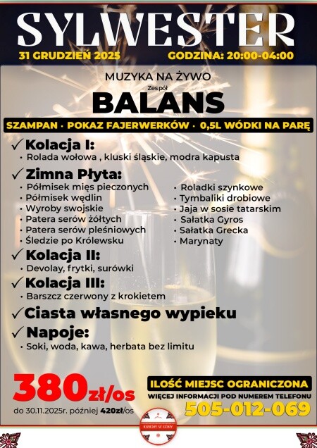 Tegoroczne wydarzenie oferuje dwie różne ceny - 380 zł za osobę dla rezerwacji dokonanych do 30 listopada oraz 420 zł od 1 grudnia. Wielu gości zwraca uwagę, że przy takim programie i jakości dań jest to bardzo rozsądna propozycja, szczególnie biorąc pod uwagę, jak dynamicznie rosną ceny imprez w regionie.