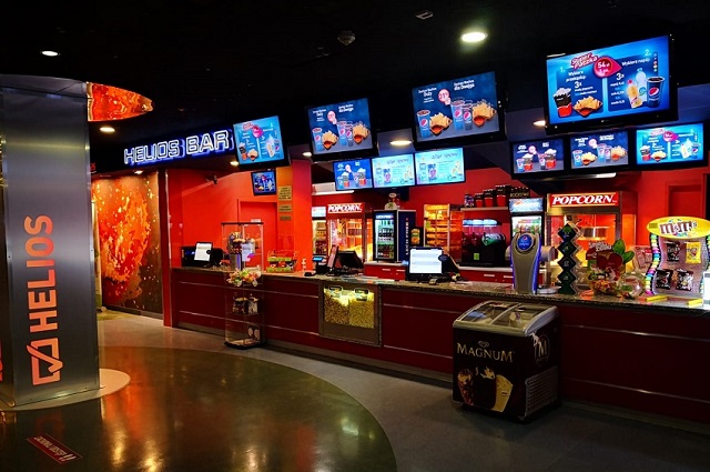 Bar kinowy oferuje popcorn, zimne i ciepłe napoje oraz duży wybór słodyczy.